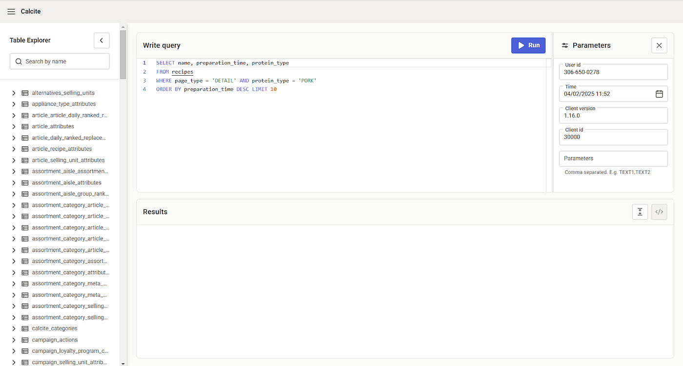 Configuring these queries can directly be done for elements in our layout, however, to allow for rapid iteration and testing, we realized that we needed to build a dedicated tool. Our second tool was born: Calcite query playground, with features like: